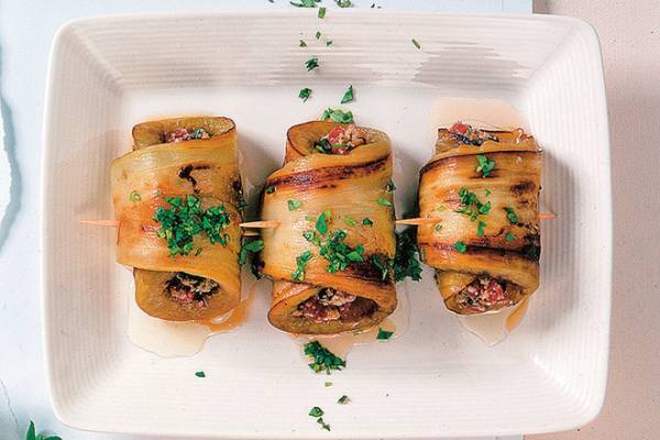 Баклажаны режем вдоль ломтиками по 1 см. Присаливаем, обжариваем с обеих сторон до золотистого цвета. Сбрызгиваем уксусом. Лук мелко режем, морковь трем на крупной терке, чеснок пропускаем через пресс. Пассеруем овощи, перемешиваем с мелко нарезанными грибами. Кладем петрушку, солим, перчим, закатываем фарш в баклажаны.