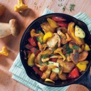 Ингредиенты ( на 4 порции): Картофель -2 шт. Грибы- 1/2 кг. Чеснок - 2 зубчика Перец болгарский -2 шт. Цукини - 1 шт. Бульон овощной -1/2 литра Томатная паста -1 ст.л. Вино белое сухое -2 ст.л. Крахмал - 1 ч.л. Соль - по вкусу Масло растительное рафинированное - 2 ст.л. Перец черный молотый -по вкусу Зелень -по вкусу Время приготовления: 30 минут Приготовление: Картофель обжариваем до полуготовности. Добавляем нарезанный полукольцами лук и раздавленные ...