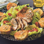 Ингредиенты (на 4 порции): Грудка куриная (филе) - 3-4 штук Зубчики чеснока -2 шт. Паприка -1 ч.л. Помидоры черри -250 граммов салат айсберг -1 кочан Лимон - 0,5 шт. Травы сушеные (душица (орегано) или смесь прованских трав) - 1 ч.л. Багет (французский батон) - (ломтики) Соевый соус Соль и перец Масло оливковое Сыр тертый Время приготовления: 20 минут Куриное филе натираем солью, перцем, паприкой и одним измельченным зубчиком чеснока. Обжариваем ...