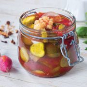 Ингредиенты (на 20 порций): Капуста цветная -2 килограмма Огурцы -3 килограмма Перец болгарский -2 шт. Помидоры -2 килограмма Лук репчатый -1/2 кг. Масло растительное рафинированное -200 миллилитров Чеснок -1 головка Сахар -1/2 стак. Соль -4 ст.л. Уксус 9% -1/2 стак. Время приготовления: 2 часа На 14 полулитровых банки: капусту делим на соцветия, огурцы шинкуем кусочками по 1−1,5 см, лук дольками. Варим отдельно в подсоленной воде: капусту – 3 минуты, ...