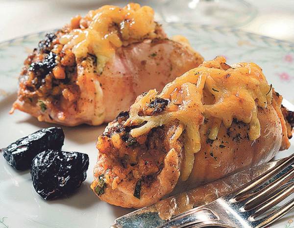 Мясо режем поперек волокон тонкими ломтиками. Солим, перчим, отбиваем. Маринуем в смеси из соевого соуса, майонеза, сливок и нашинкованного лука 10 минут. На край короткой стороны каждого ломтика выкладываем немного нарезанного чернослива, посыпаем сыром.