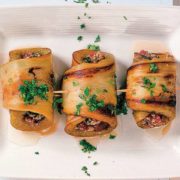 Ингредиенты (на 4 порции): Баклажаны -4 шт. Лук репчатый -1 шт. Морковь -1/2 шт. Грибы -300 гр. Чеснок -1 зубчик Уксус винный -1 ст.л. Петрушка, соль Масло растительное рафинированное -1 ст.л. Время приготовления: 30 минут Баклажаны режем вдоль ломтиками по 1 см. Присаливаем, обжариваем с обеих сторон до золотистого цвета. Сбрызгиваем уксусом. Лук мелко режем, морковь трем на крупной терке, чеснок пропускаем через пресс. Пассеруем овощи, перемешиваем ...
