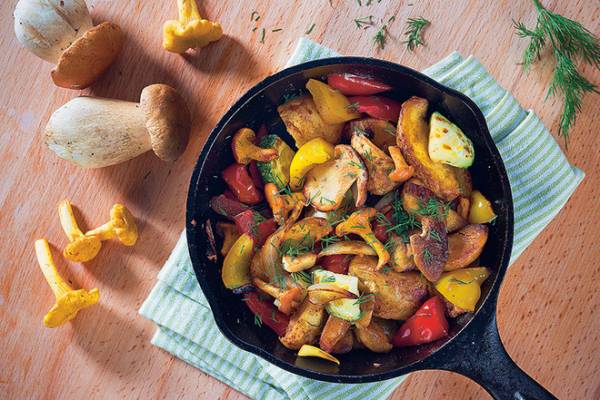 Заливаем полученной смесью овощи и грибы. Оставляем на тихом огне под крышкой на 15 минут или до тех пор, пока картофель не сварится. Вливаем в готовое блюдо разведенный в небольшом количестве холодной воды крахмал, перемешиваем и снимаем с огня.
